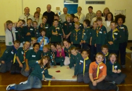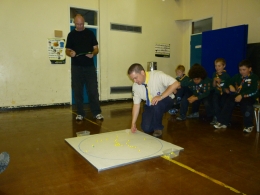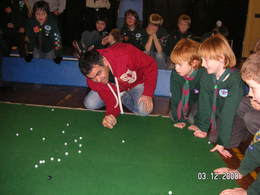 Demonstration session (below): Our visit and marbles demonstration to the Scouts (Cubs and Beavers) in North Leeds in November and December 2008. It was great to initiate scouts to marbles and they thoroughly enjoyed it. As well as a brief history of marbles, the Tinsley Green tournament (and Cups) and our team, we set them to play games, with five scouts and a member of the Yorkshire Meds in each team, and Mourad being the referee. | ||